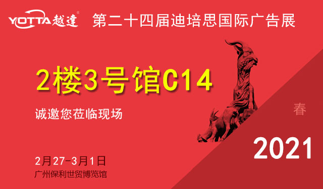 展會名稱:第二十四屆迪培思廣州國際廣告展 展會時間:2021年2月27日-3月1日 展位號: 2樓3號館C14 展地址:廣州市海珠區新港東路1000號保利世貿博覽館