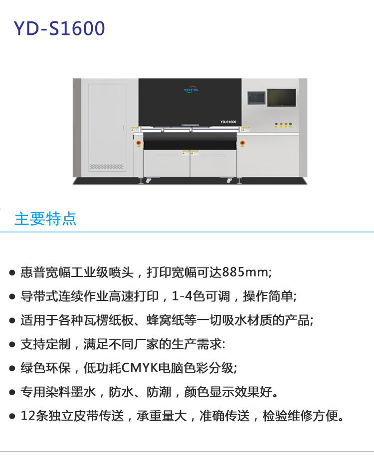 YD-S1600高速瓦楞數碼印刷機,采用惠普寬幅工業級噴頭,單個噴頭打印寬幅可達297mm,最大寬度可達885mm,導帶式連續作業高速打印,無需制版,操作簡單,滿足不同廠家的生產需求。